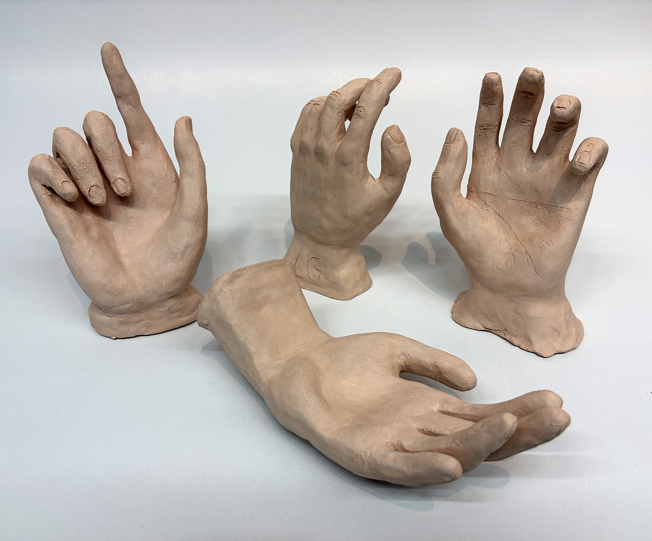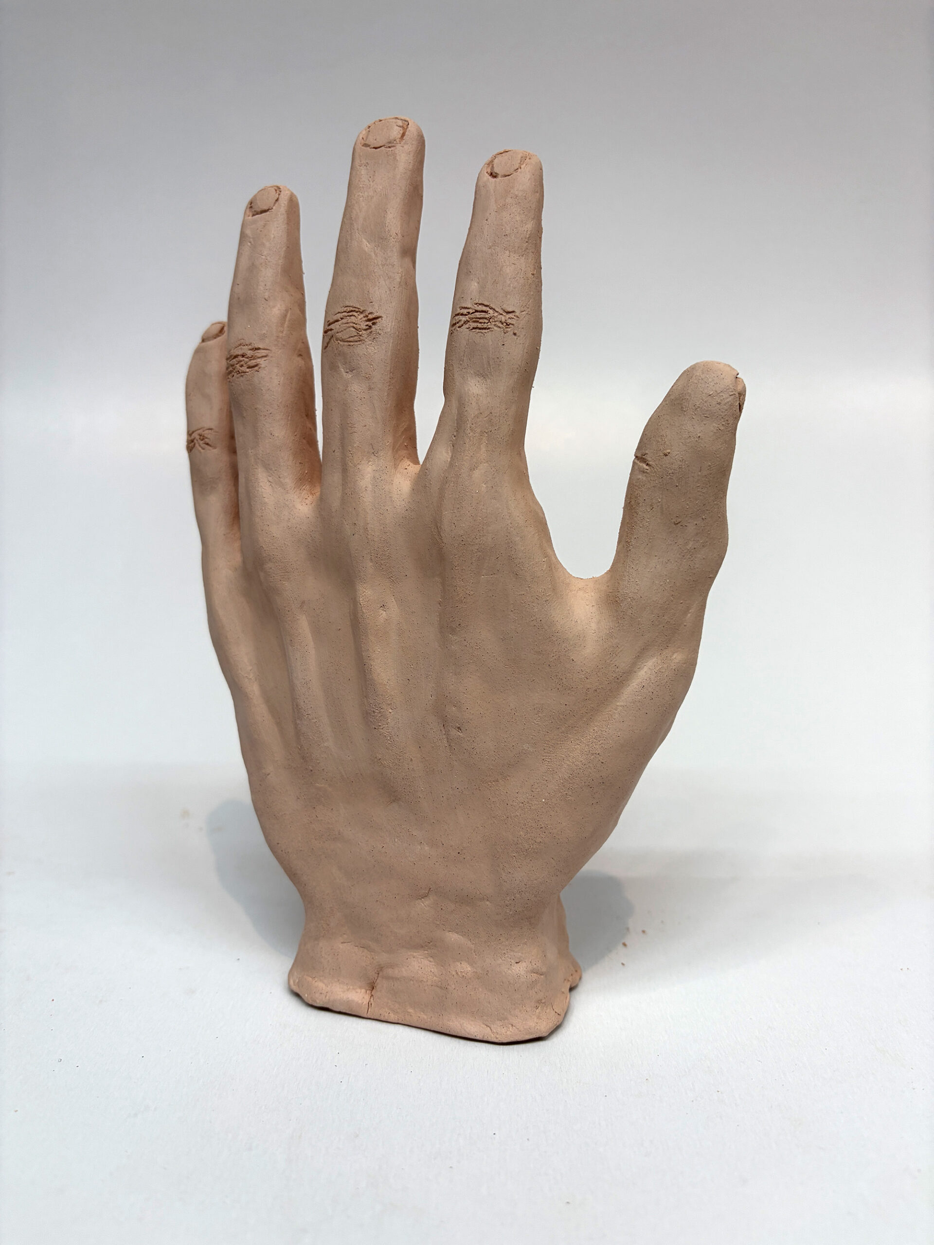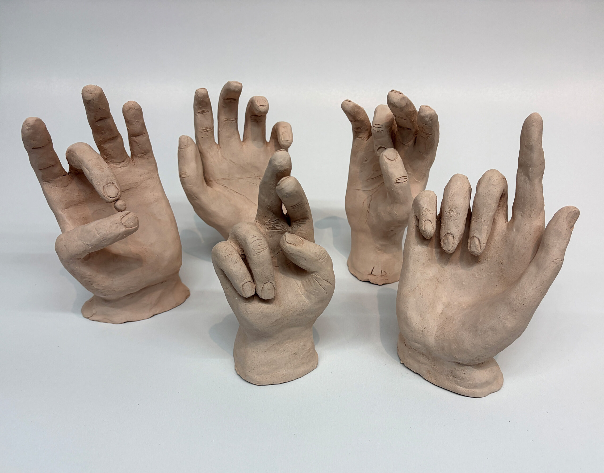 Gearbeitet wurde aus einem kompletten Tonstück, das Schritt für Schritt zur Handform modelliert wurde. Als Live-Modell dienten die eigene Hand oder die des Sitznachbarn, die immer wieder genau beobachtet und studiert wurden, um Haltung, Spannung und Anatomie wirklich zu verstehen. Begleitet wurde der Prozess durch regelmäßige Rücksprachen und gemeinsame Werkbesprechungen mit Frau Halde, in denen Form, Details und Ausdruck weiter verfeinert wurden. Nach dem Trocknen wurden die Arbeiten gebrannt, sodass aus den Momentaufnahmen der Gesten dauerhafte keramische Objekte entstanden.