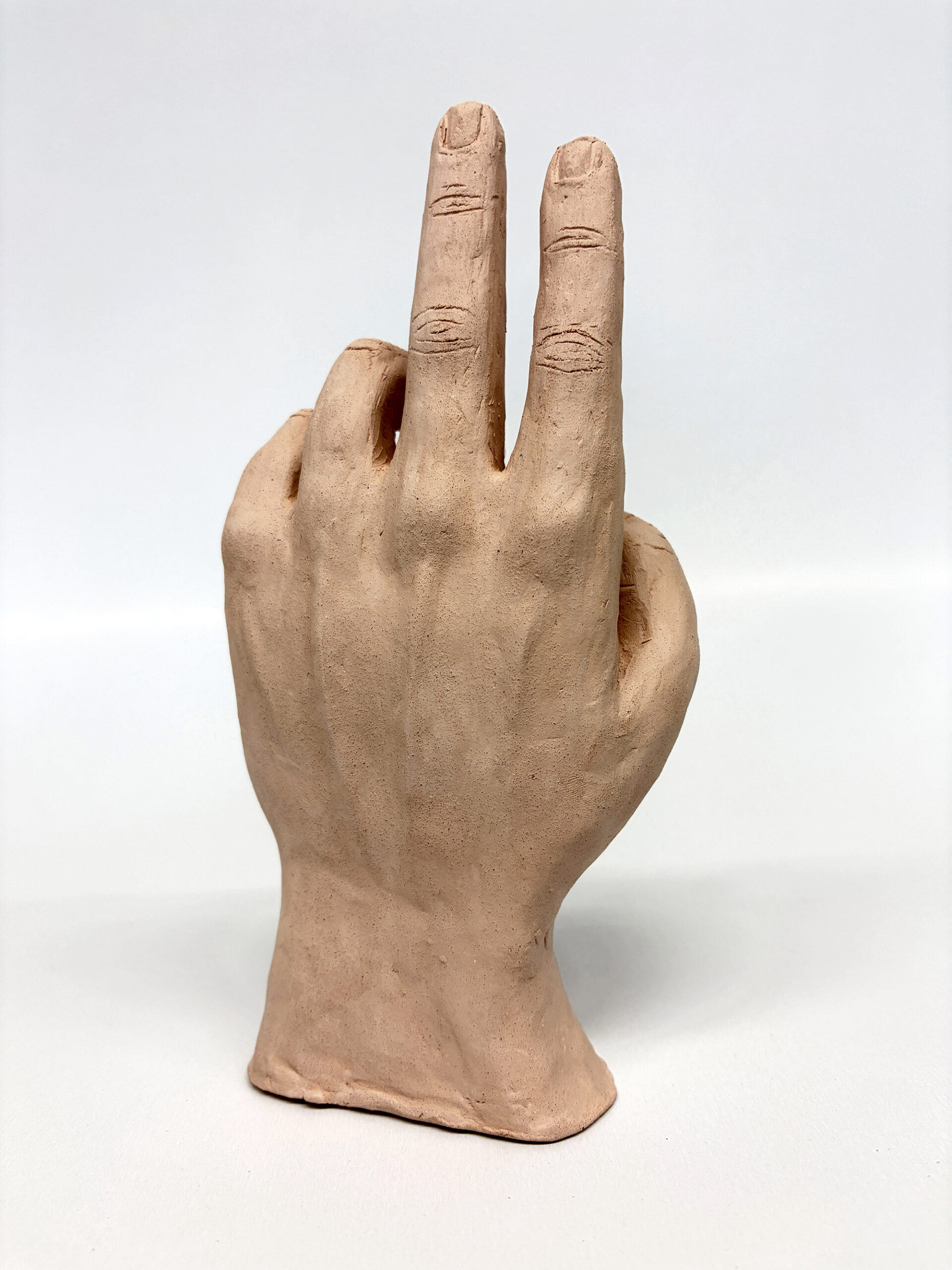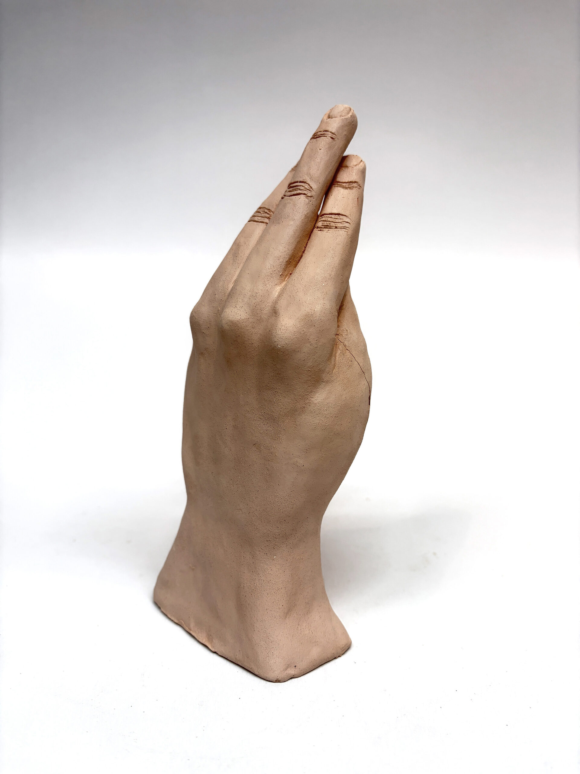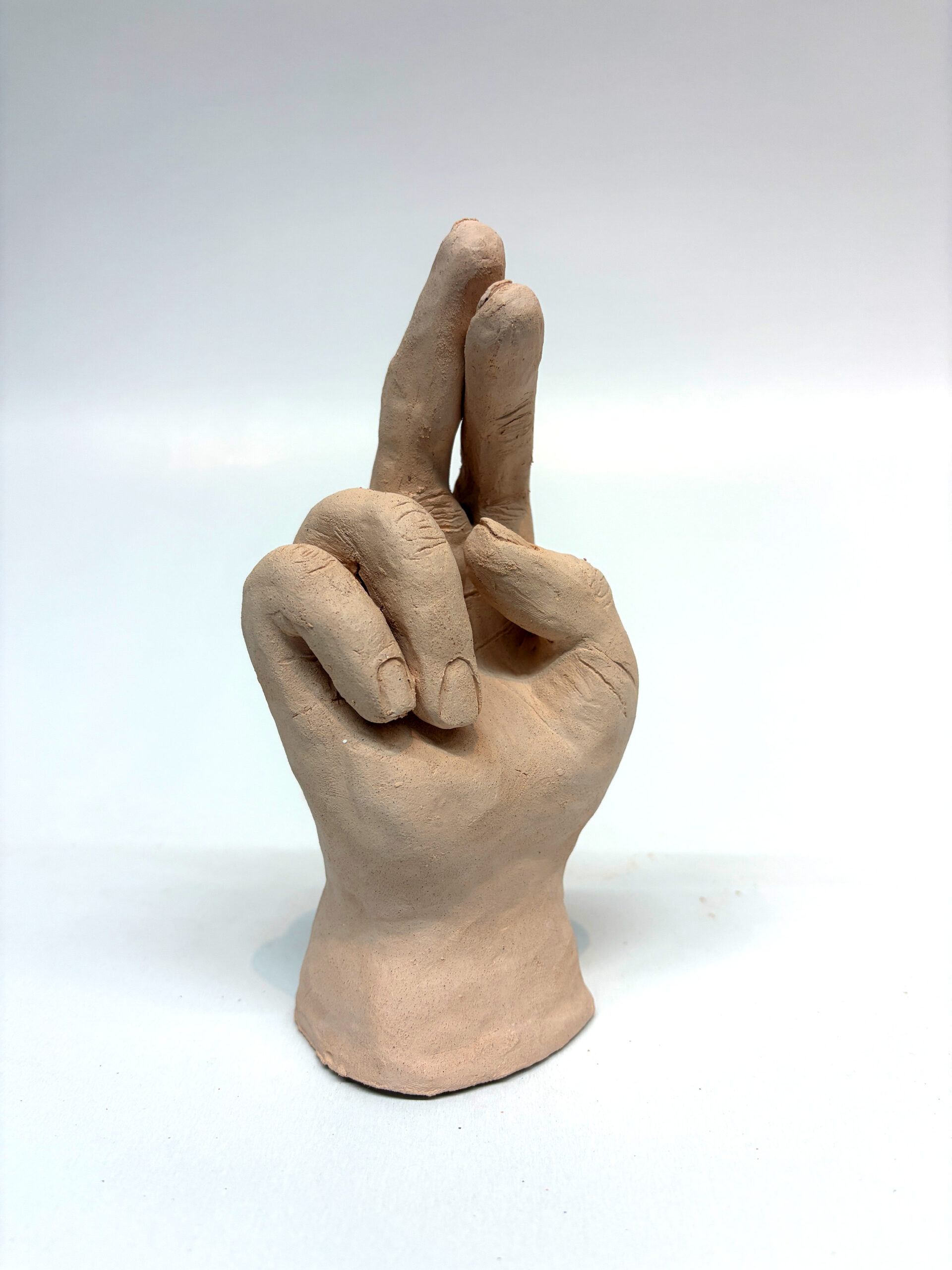 Gearbeitet wurde aus einem kompletten Tonstück, das Schritt für Schritt zur Handform modelliert wurde. Als Live-Modell dienten die eigene Hand oder die des Sitznachbarn, die immer wieder genau beobachtet und studiert wurden, um Haltung, Spannung und Anatomie wirklich zu verstehen. Begleitet wurde der Prozess durch regelmäßige Rücksprachen und gemeinsame Werkbesprechungen mit Frau Halde, in denen Form, Details und Ausdruck weiter verfeinert wurden. Nach dem Trocknen wurden die Arbeiten gebrannt, sodass aus den Momentaufnahmen der Gesten dauerhafte keramische Objekte entstanden.