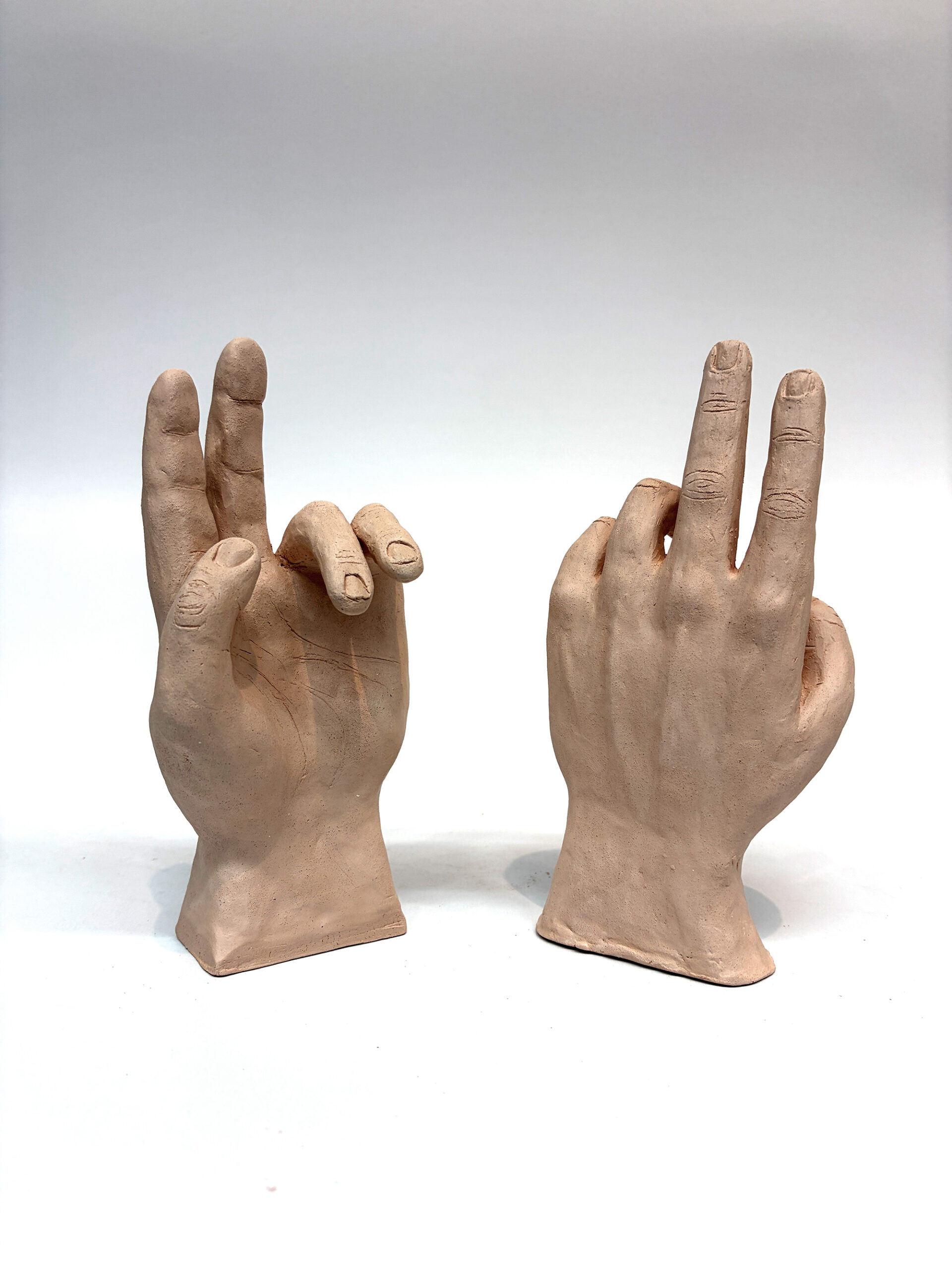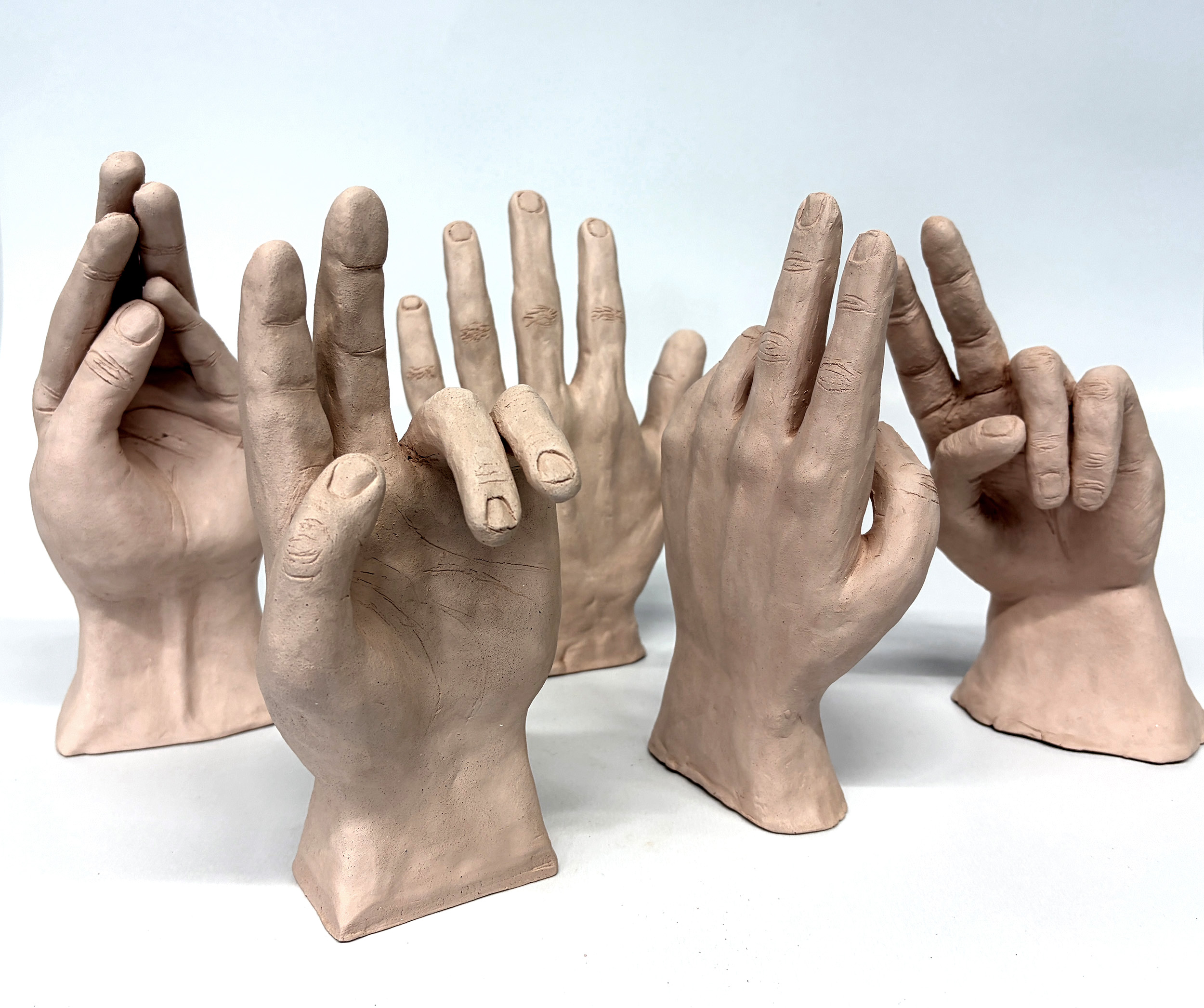 Fünf realistische Tonskulpturen von Händen mit verschiedenen Gesten auf einem schlichten weißen Hintergrund.