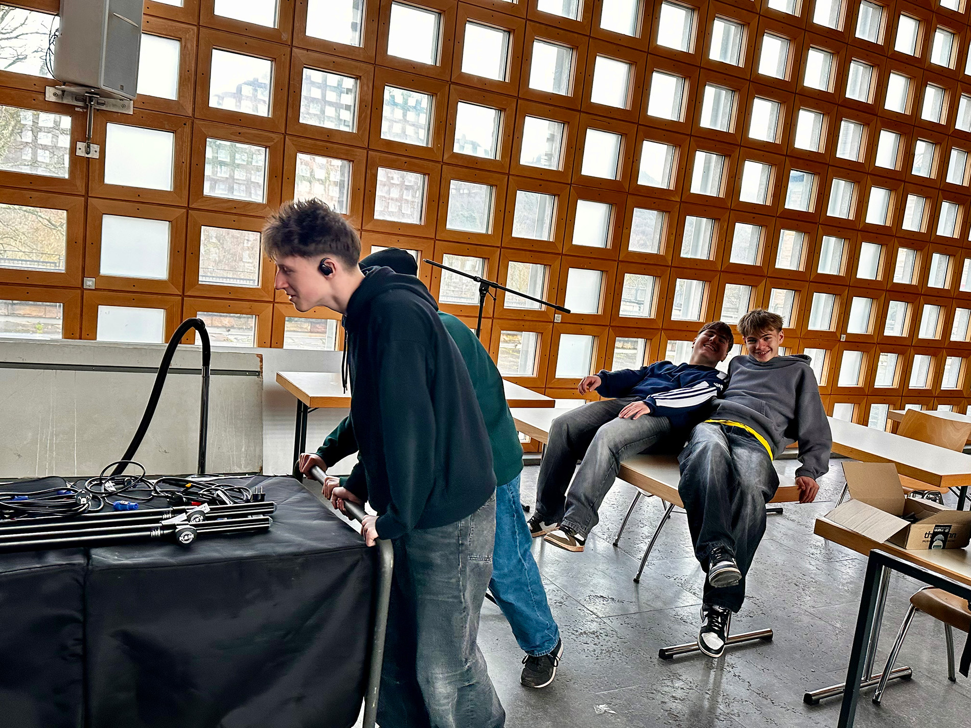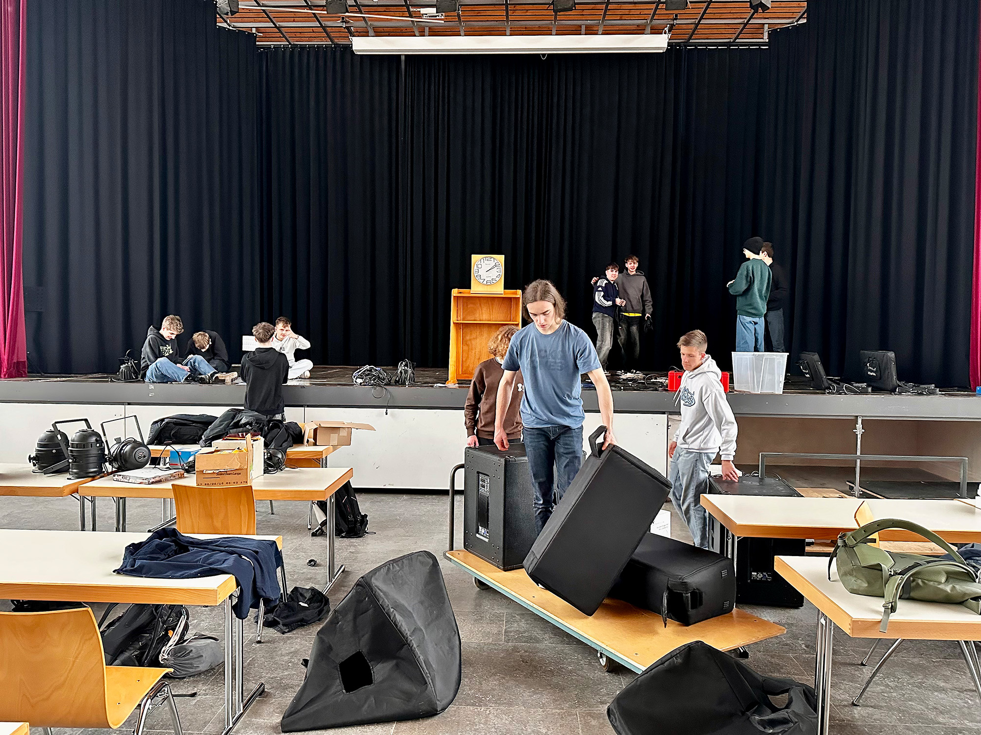 Im Mittelpunkt stand die umfassende Neuorganisation der Veranstaltungstechnik in der Aula. Unter der Anleitung von Herrn Wohlert wurden sämtliche Geräte gesichtet, neu sortiert, inventarisiert und eindeutig beschriftet. Zudem erhielten die neuen Mitglieder eine erste praxisnahe Einführung in die technische Ausstattung der Aula sowie in die organisatorischen Abläufe rund um Licht- und Tontechnik.